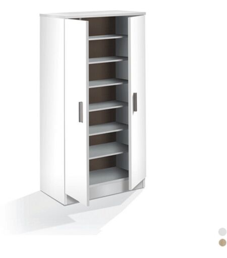 Armadio portascarpe 2 ante con 6 ripiani L'armadio portascarpe 2 ante con 6 ripiani è la soluzione perfetta per organizzare i tuoi scarpe in modo pratico e funzionale. Realizzato in resistente materiale melaminico di colore bianco, questo armadio è progettato per durare nel tempo. Caratteristiche: Dimensioni: cm 108x55x36 Ripiani posizionabili a diverse altezze Cerniere metalliche per una maggiore resistenza Supporti in metallo per i ripiani Maniglie in ABS colore grigio alluminio Tacchetti in ABS antirumore e antigraffio per la parte inferiore del mobile Richiede montaggio Con l'armadio portascarpe 2 ante con 6 ripiani, avrai tutto lo spazio di cui hai bisogno per riporre le tue scarpe in modo ordinato e accessibile. Non perdere tempo alla ricerca di una scarpa specifica, grazie a questo armadio avrai tutto a portata di mano. Scegli la praticità e l'eleganza del nostro armadio portascarpe per organizzare al meglio il tuo spazio. Acquista ora l'armadio portascarpe 2 ante con 6 ripiani ...