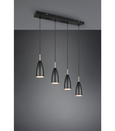 Il lampadario a sospensione FARIN di Trio Lighting è composta da una struttura lineare in metallo finitura nero opaco. I 4 diffusori hanno una forma conica ed emettono una luce diretta verso il basso. Inserto decorativo sopra ogni portalampada in ottone satinato. Cavetti regolabili che consentono di regolare l'altezza dei punti luce in base i propri gusti ed esigenze. E' possibile installare 4 lampadine con attacco E14 da max 25 watt, lampadine non incluse nella confezione. Grazie all'utilizzo di lampadine Led si otterrà una migliore resa luminosa e un basso consumo energetico. Un elemento semplice dal design moderno ed originale, ideale per diversi ambienti della vostra casa. Consigliato ad esempio per illuminare l'isola di una cucina, il tavolo di una sala da pranzo o ancora tavoli e banconi di locali commerciali come bar e ristoranti. Disponibile anche la variante a 1 o 6 luci o la versioni di colore nichel. ...
