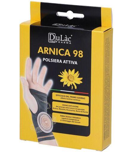 Dulàc Arnica 98 Polsiera Attiva - Taglia 2 Tutore elastico per il polso. Non è semplicemente un tutore per la mano e il polso: si tratta di una speciale fascia che, grazie alla tecnologia con cui è realizzata, ti offre sostegno, termoregolazione e un effetto lenitivo continuo. Sviluppata in fibra di ceramica elastica, assorbe il calore che la pelle disperde e lo rimanda indietro, regolando la temperatura corporea. È inoltre ricca di straordinarie micro-capsule che si schiudono sulla cute con lo sfregamento, rilasciando principi attivi naturali e benefici: arnica, mentolo, olio essenziale di rosmarino, olio di semi di girasole e burro di karité. Adatta sia per il polso destro che il polso sinistro, ti dona il sollievo di cui hai bisogno. Polsiera Attiva è adatta a tutte le persone che soffrono di fastidi alla mano e al polso e necessitano di sollievo continuo. Unisex ed estremamente elastica, si adegua alla mano destra o alla mano sinistra offrendo comfort e benessere per l'intera durata di utilizzo. Modalità d'uso: Indossare la fascia elastica posizionandola sul polso e la mano: la bordatura arancione deve stare in alto. É possibile usare Polsiera Attiva quotidianamente oppure occasionalmente, ogni volta in cui si evince il bisogno (anche durante lo sport). É consiglito utilizzarla per almeno mezza giornata in modo da consentire un'efficace diffusione dei principi attivi. Ingredienti: Helianthus Annuus Seed Oil, Rosmarinus Officinalis Leaf Oil, Menthol, Butyrospermum Parkii Butter, Arnica Montana Flower Extract, Tocopheryl Acetate, Limonene, Linalool, Eugenol, Citronellol. Composizione del tessuto: 82% Poliammide / 18% Elastan. Lavare ad un massimo di 30°C, non utilizzare l'asciugatrice; non stirare. ...