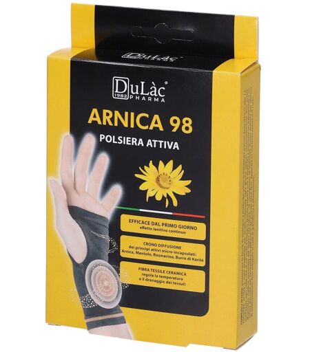 Dulàc Arnica 98 Polsiera Attiva - Taglia 3 Tutore elastico per il polso. Non è semplicemente un tutore per la mano e il polso: si tratta di una speciale fascia che, grazie alla tecnologia con cui è realizzata, ti offre sostegno, termoregolazione e un effetto lenitivo continuo. Sviluppata in fibra di ceramica elastica, assorbe il calore che la pelle disperde e lo rimanda indietro, regolando la temperatura corporea. È inoltre ricca di straordinarie micro-capsule che si schiudono sulla cute con lo sfregamento, rilasciando principi attivi naturali e benefici: arnica, mentolo, olio essenziale di rosmarino, olio di semi di girasole e burro di karité. Adatta sia per il polso destro che il polso sinistro, ti dona il sollievo di cui hai bisogno. Polsiera Attiva è adatta a tutte le persone che soffrono di fastidi alla mano e al polso e necessitano di sollievo continuo. Unisex ed estremamente elastica, si adegua alla mano destra o alla mano sinistra offrendo comfort e benessere per l'intera durata di utilizzo. Modalità d'uso: Indossare la fascia elastica posizionandola sul polso e la mano: la bordatura arancione deve stare in alto. É possibile usare Polsiera Attiva quotidianamente oppure occasionalmente, ogni volta in cui si evince il bisogno (anche durante lo sport). É consiglito utilizzarla per almeno mezza giornata in modo da consentire un'efficace diffusione dei principi attivi. Ingredienti: Helianthus Annuus Seed Oil, Rosmarinus Officinalis Leaf Oil, Menthol, Butyrospermum Parkii Butter, Arnica Montana Flower Extract, Tocopheryl Acetate, Limonene, Linalool, Eugenol, Citronellol. Composizione del tessuto: 82% Poliammide / 18% Elastan. Lavare ad un massimo di 30°C, non utilizzare l'asciugatrice; non stirare. ...