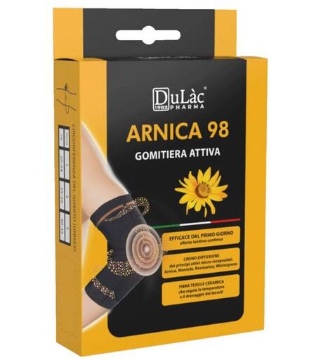 #html-body [data-pb-style=Y8VC5Y4]{justify-content:flex-start;display:flex;flex-direction:column;background-position:left top;background-size:cover;background-repeat:no-repeat;background-attachment:scroll}Indicazioni Gomitiera elastica Dulàc. La fascia assorbe il calore disperso dalla pelle e lo restituisce alla zona trattata, regolando così la temperatura. Azione Protettiva Lenitiva. Destinazione d'uso Gomito. Caratteristiche Il tessuto è sviluppato con una speciale procedura che unisce la fibra di ceramica ultra flessibile a delle speciali micro-capsule, ricche di principi attivi benefici.Le microcapsule fissate sul tessuto, a base di Arnica, mentolo e olio essenziale di rosmarino, si schiudono con lo sfregamento e ti donano sollievo costante.A contatto con la pelle, le microcapsule rilasciano i seguenti principi attivi: Arnica montana e mentolo:Leniscono l'area interessata. Olio essenziale di rosmarino:Rilassa e distende. Olio di semi di girasole e burro di karité:Proteggono e idratano. Modalità d'uso e Posologia Indossa la fascia di sostegno posizionandola al livello del gomito: la bordatura arancione deve stare in alto. Puoi usarla quotidianamente oppure in maniera occasionale, anche durante l'attività sportiva. Ti consigliamo di indossare Gomitiera Attiva per almeno mezza giornata in modo che i principi attivi si diffondano in maniera ottimale. Avvertenze e Controindicazioni Lavare ad un massimo di 30°C, non utilizzare l'asciugatrice, non stirare. Ingredienti e Composizione Helianthus Annuus Seed Oil, Rosmarinus Officinalis Leaf Oil, Menthol, Butyrospermum Parkii Butter, Arnica Montana Flower Extract, Tocopheryl Acetate, Limonene, Linalool, Eugenol, Citronellol. Composizione del tessuto:82% Poliammide / 18% Elastan. Formato 1 scatola (1 pezzo).Taglia 3. ...