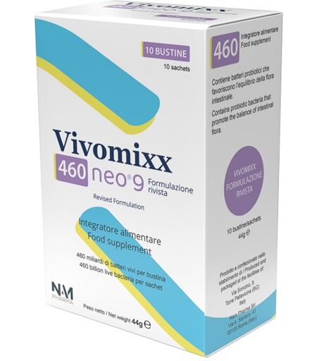 Vivomixx 460 neo 9 - Descrizione Integratore alimentare. Contiene batteri probiotici che favoriscono l'equilibrio della flora intestinale. Ingredienti per 1 bustina Maltosio, miscela di batteri lattici e bifidobatteri [Lacticaseibacillus paracasei IMC 502 (190 miliardi UFC*), Lacticaseibacillus rha… ...