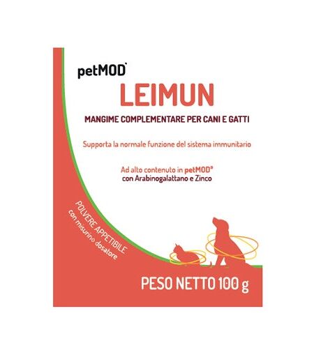 petMOD LEIMUN Descrizione Mangime complementare in polvere appetibile per cani e gatti, formulato ad alto contenuto in petMOD, con arabinogalattano e zinco per supportare la normale funzione del sistema immunitario animale. Composizione Prodotti del lievito (petMOD-Nucleotidi 5') 37,5%, maltodestrina, lieviti (lievito di birra inattivo 5% nucleotidi 5') 10%, proteine animali idrolizzate (origine avicola), arabinogalattano (da corteccia di larice) 4%, sale di magnesio dell'acido stearico. Additivi nutrizionali: vitamine, provitamine e sostanze ad effetto analogo chimicamente ben definite (3a300 vitamina C 10.000 mg/kg, 3a671 vitamina D3 3.000 UI/kg); composti di oligoelementi: 3b607 zinco chelato della glicina, idrato 3.000 mg/kg (zinco 780 mg/kg); additivi organolettici: prodotti naturali biologicamente definiti [olivo (Olea europaea L.) estratto 15.000 mg/kg, curcuma (Curcuma longa L.) estratto 5.000 mg/kg]; additivi tecnologici: E551b silice colloidale. Componenti ...