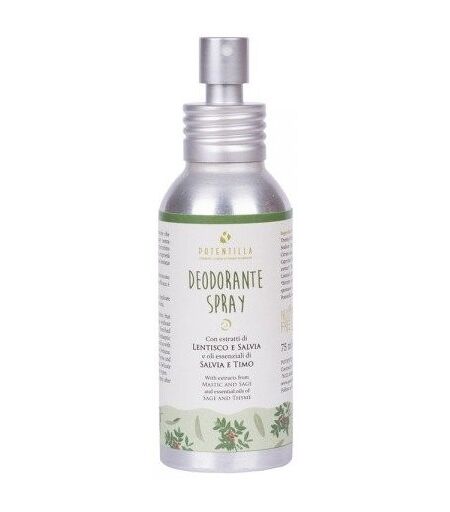 Deodorante Lentisco e Salvia Potentilla: Deodorante spray antibatterico ed astringente. Evita la formazione di cattivi odori senza impedire la normale traspirazione. Per tutti i tipi di pelle. Con salvia, lentisco ed oli essenziali di timo e salvia. Agita prima dell'uso, vaporizzando su pelle asciutta e pulita. Il Deodorante Lentisco e Salvia di Potentilla è un deodorante innovativo per tutti i tipi di pelle. A base di salvia, lentisco ed oli essenziali di timo e salvia dall'azione sudorifera, antibatterica, astringente ed antisettica che conferisce un gradevole aroma secco e fresco. Consigli d'uso: Agita prima dell'uso, vaporizzando su pelle pulita ed asciutta. INCI AQUA, ALCOHOL, POLYGLYCERYL-4 CAPRATE, TRIETHYL CITRATE, TRISODIUM CITRATE, ZINC RICINOLEATE, SODIUM CAPROYL/LAUROYL LACTYLATE (AND) TRIETHYL CITRATE (AND) SALVIA OFFICINALIS (SAGE) OIL, GLYCERYL CAPRYLATE, PISTACIA LENTISCUS EXTRACT*, SALVIA PRATENSIS EXTRACT*, THYMUS VULGARIS OIL, EUGENOL, LIMONENE, LINALOOL, CITRIC ACID. *Estratto prodotto da potentilla, ricavato da piante spontanee raccolte a mano. Controlliamo con cura le descrizioni dei nostri prodotti ma alcuni dati riportati sulla confezione del prodotto (INCI, consigli di utilizzo, certificazioni) possono variare in base agli aggiornamenti dei produttori. Non sempre questi aggiornamenti ci vengono comunicati e può capitare che le informazioni sulla confezione differiscano da quelle riportate qui sul sito. Ti chiediamo perciò di fare sempre riferimento alle informazioni che trovi sul prodotto. Le immagini riportate hanno uno scopo puramente indicativo e possono essere soggette a variazioni da parte dei produttori. ...
