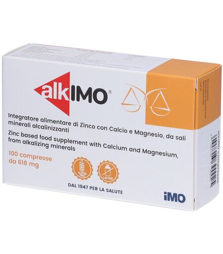 Gli integratori non sostituiscono un'alimentazione equilibrata e variegata e uno stile di vita sano.Integratore Alimentare di Zinco con Calcio e Magnesio, e sali minerali alcalinizzanti. Prodotto utile nei casi di aumentato fabbisogno o di ridotto apporto con la dieta di tali nutrienti.Lo Zinco contribuisce al normale metabolismo acido-base dell'organismo.Ingredienti: Bicarbonato di sodio, Bicarbonato di potassio, Calcio carbonato, Magnesio idrossido, Sodio citrato, Zinco gluconato.Informazioni Nutrizionali: per 100 g per dose al dì max 8 cpr % RDA giornaliera per dose max Calcio carbonato 13,813 g 663,04 mg 30 % di cui Calcio 5 g 240 mg Magnesio idrossido 4,5 g 216 mg 24% di cui Magnesio 1,87 g 90 mg Zinco gluconato 0,872 g 41,856 mg 60% di cui Zinco 0,125 g 6 mg Modo d'uso:Assumere 3-4 compresse da deglutire con un po’ di acqua, 2 volte al giorno, 2 ore dopo pranzo e 2 ore dopo cena.Avvertenze:Non eccedere le dosi raccomandate per l’assunzione giornaliera. Il prodotto deve essere tenuto fuori dalla portata dei bambini al di sotto dei 3 anni d’età.Per l’origine dei suoi componenti, Alkimo può essere assunto nell’ambito di una dieta vegetariana o vegana. L’assunzione deve essere accompagnata da un’adeguata attività fisica e da un corretto regime alimentare.Conservazione:Conservare in luogo fresco ed asciutto.Contenuto netto:Blister da 100 compresse rivestite = 61,8 gProduttore: IMO S.p.A.Via Firenze, 3420060 Trezzano Rosa (MI)Italia ...