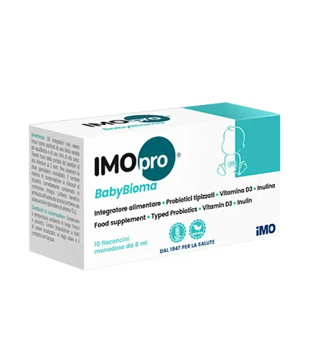 Imopro Baby Bioma è un integratore per bambini con fermenti lattici, vitamina D3 e inulina. Aiuta la flora intestinale e le difese immunitarie. Formato: 10 flaconcini 8ml al gusto fragola. Senza glutine e adatto anche a diete vegetariane. ...