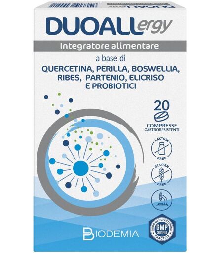 DUOALLergy - Descrizione Integratore alimentare a base di quercetina, perilla, Boswellia, ribes, partenio, elicriso e probiotici, utile per apportare una quota integrativa di tali ingredienti all'alimentazione quotidiana. La perilla favorisce le naturali difese dell'organismo. Il ribes e l'elicriso… ...