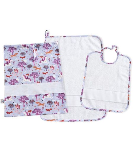 HOMMOO Filet - Set Asilo 3 Pezzi Fantasia Fiabesca con Tela Aida da Ricamare, Composto da Sacchetto, Asciugamano e Bavaglino in Spugna Bianca, 100% Cotone,