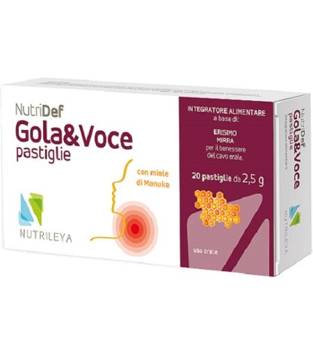 Nutridef Gola & Voce - Descrizione Integratore alimentare a base di Erisimo ad azione emolliente e lenitiva sulla mucosa orofaringea e di supporto per il tono della voce. Con mirra e miele di Manuka. Gusto miele. Ingredienti Saccarosio, sciroppo di glucosio, erisimo (Sisymbrium officinale Scop.) es… ...