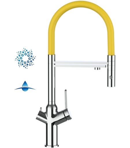 VIZIO Rubinetto 4 vie miscelatore cucina cromato con canale separato per acqua filtrata, canna gialla movibile e doccia due getti staccabile - serie bod