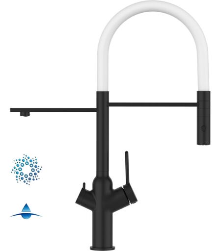 VIZIO Rubinetto 4 vie miscelatore cucina Nero Opaco con canale separato per acqua filtrata, canna bianca movibile e doccia due getti staccabile - serie bod