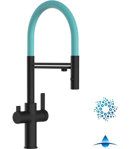 VIZIO Rubinetto 4 vie miscelatore cucina Nero Opaco con canale separato per acqua filtrata, canna turchese movibile e doccia due getti staccabile - Serie fc
