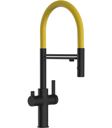 VIZIO Rubinetto 3 vie miscelatore cucina Nero Opaco con canale separato per acqua filtrata, canna gialla movibile e doccia due getti staccabile - Serie fc