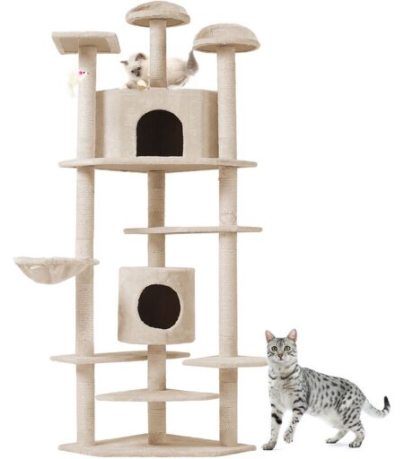 La soluzione ideale per dare al proprio micio un posto dove dormire, giocare e farsi le unghie lasciando integro l’arredamento di casa. Qualsiasi gatto amerà questo tiragraffi, poiché riproduce un vero albero con tutti i benefici di un elemento d'arredo in termini di sicurezza. Il tiragraffi mette a disposizione dei gatti una struttura dotata di superfici per affilare gli artigli, ma anche un luogo in cui giocare, in cui mettere in mostra le proprie abilita di scalatore, in cui allenarsi a saltare o semplicemente un cantuccio in cui schiacciare un pisolino. Questo tiragraffi ad albero, è dotato di 9 piattaforme disposte su diversi livelli affinché i gatti possano facilmente saltare o arrampicarsi da un livello all'altro. Può essere posizionato accanto alla parete o di fronte a una finestra, in modo tale che i gatti godano anche del panorama esterno. Grazie alla sua base, è estremamente stabile, perfetto per uno o più gatti contemporaneamente. Caratteristiche principali: - Altezza: 203 ...
