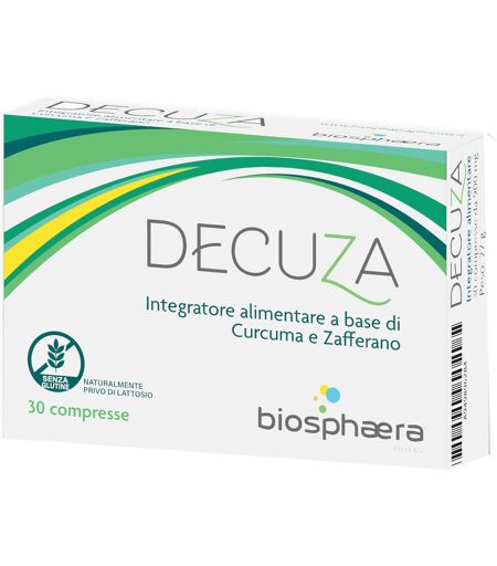 DECUZA Descrizione Integratore alimentare a base di curcuma Meriva e.s. e zafferano Affron. Ingredienti Meriva [Curcuma (Curcuma longa L.) rizoma e.s. tit. 20% in curcuminoidi totali]; agenti di carica: fosfato dicalcico, cellulosa; agente antiagglomerante: idrossi-propil-cellulosa; Affron [zafferano (Crocus sativus L.) e.s. stimmi tit. 3,5% Lepticrosalides]; agenti antiagglomeranti: sali di magnesio degli acidi grassi, biossido di silicio. Senza glutine. Naturalmente privo di lattosio. Caratteristiche nutrizionali Valori medi per 1 compressa per 2 compresse Curcuma Meriva e.s. apporto in curcuminoidi 500 mg 100 nf 1.000 mg 200 mg Affron zafferano e.s. 16 nf 32 nf Modalità d'uso Si consiglia l'assunzione di 1-2 compresse al giorno al bisogno. Avvertenze Non superare la dose giornaliera consigliata. Tenere fuori dalla portata dei bambini al di sotto dei 3 anni di età. Gli integratori alimentari non vanno intesi come sostituti di una dieta variata ed equilibrata e di uno stile di vita sano. In caso di alterazioni della funzione epatica, biliare o di calcolosi delle vie biliari, l'uso del prodotto è sconsigliato. Non usare in gravidanza e allattamento. Non utilizzare per periodi prolungati senza consultare il medico. Se si stanno assumendo farmaci è opportuno sentire il parere del medico. In caso di ipersensibilità o allergia individuale verso uno o più componenti, evitare l'uso del prodotto. Conservazione Conservare in luogo fresco e asciutto lontano da fonti di luce e calore. Il termine minimo di conservazione si riferisce al prodotto correttamente conservato. Non disperdere nell'ambiente dopo l'uso. Validità post-apertura: 36 mesi. Formato 30 compresse. Cod. BSDECUZA ...
