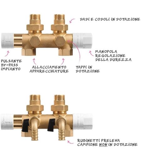 Kit Facile è un dispositivo multifunzionale per facilitare e standardizzare l’installazione degli impianti Acqua Brevetti. Kit Facile è realizzato con corpo in ottone, pulsante di by-pass e valvola di regolazione della durezza; dadi e codoli in dotazione per il collegamento idraulico. La manopola bianca a pressione contraddistinta da una freccia accompagnata dalla scritta “Push for by-pass” è il pulsante di by-pass. La manopola bianca a vite contraddistinta da una doppia freccia e dai simboli “+” e “-“ è la valvola per la regolazione della durezza. Nella parte frontale di Kit Facile si trovano le predisposizioni per il montaggio di due rubinetti preleva-campioni. I rubinetti consentono di prelevare acqua a monte e a valle del trattamento per verificarne l’efficacia (grado di addolcimento, dosaggio di anti-incrostanti ed anti-corrosivi). ...