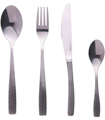 In acciaio inox 18/0 Impugnatura martellata Il set si compone di 4 cucchiaini, 4 cucchiai, 4 forchette, 4 coltelli Colore: silver lucido Cucchiaio: l. 20,5 cm - spessore 2 mm Forchetta: l. 20,5 cm - spessore 2 mm Coltello: l. 22 cm - spe ...