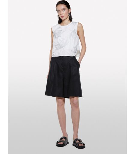 Bermuda nero in 100% lino a vita alta. Pinces frontali, chiusura a zip e bottone, due tasche alla francese davanti e due tasche a filetto dietro. Articolo realizzato con materiale in 100% lino coltivato in Europa. ...