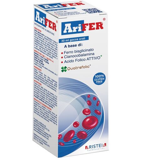 AriFER Gocce - Descrizione Integratore alimentare a base di ferro, cianocobalamina (vitamina B12) ed acido folico (vitamina B9), in grado di contribuire alla normale formazione dei globuli rossi e dell'emoglobina, alla riduzione della stanchezza e dell'affaticamento e alla crescita dei tessuti mate… ...