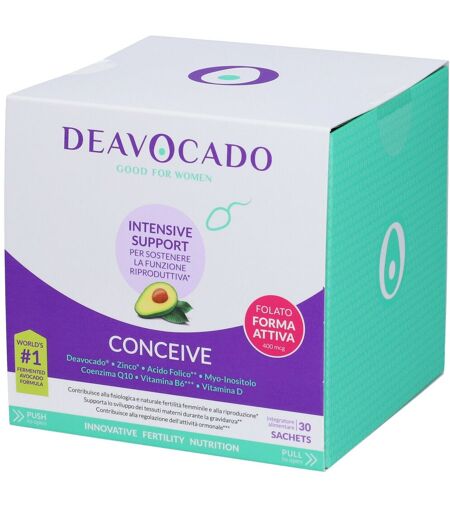 Gli integratori non sostituiscono un’alimentazione equilibrata e variegata e uno stile di vita sano. Integratore alimentare con edulcorante, con formula potenziata a base di avocado ad azione antiossidante e ricostituente, con zinco che contribuisce alla normale fertilità, alla normale riproduzione e alla protezione delle cellule dallo stress ossidativo. Acido folico, vitamina D e vitamina B12 intervengono nel processo di divisione cellulare e in particolare la vitamina B6 e la B12 contribuiscono anche alla riduzione della stanchezza e dell'affaticamento. Inoltre zinco, vitamina B6, acido folico e vitamina B12 contribuiscono alla normale funzione del sistema immunitario. Ingredienti: Maltodestrine, deavocado 100% italiano (Persea americana Mill. frutto, fermentato) polvere, myo-inositolo, aroma; correttore di acidità: acido citrico; agente antiagglomerante: biossido di silicio; coenzima Q10, vitamina D3 (colecalciferolo), vitamina B12 (cianocobalamina); emulsionante: monoleato di poliossietilensorbitano, gluconato di zinco; edulcorante: sucralosio; vitamina B6 (cloridrato di piridossina), acido folico [acido (6S)-5- metiltetraidrofolico, sale della glucosamina]. Senza glutine e senza lattosio. Valori medi per 1 bustina %Vnr* Deavocado 100% FAP 1.000 mg Myo-inositolo 1.000 mg Coenzima Q10 40 mg Zinco 1,5 mg 15 Vitamina B6 4,6 mg 329 Acido folico 400 mcg 200 Vitamina D 50 mcg 1.000 Vitamina B12 12,5 mcg 500 *Vnr = Valori Nutritivi di Riferimento Assunzione consigliata: 1 bustina al giorno da sciogliere in 150 ml di acqua. Mescolare bene fino al completo discioglimento della polvere ed assumere. Si consiglia l’assunzione tre mesi prima di pianificare il concepimento. Avvertenze: Non superare la dose giornaliera consigliata. Tenere fuori dalla portata dei bambini di età inferiore a 3 anni. Conservazione: Conservare in un luogo fresco e asciutto. Si prega di fare riferimento, se necessario, ad ulteriori istruzioni riportate sulla confezione. Contenuto netto: 30 bustine. Produttore: Pecten Group Srl Via Gaetano Malasoma, 24 56121, Pisa, PI Italia ...