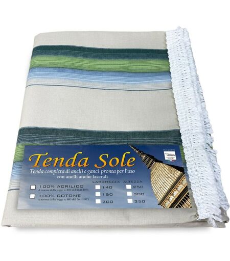 Tenda sole 'california verde' confezionata già pronta per l'uso realizzata in tessuto indistruttibile di acrilico. Rifinita nella parte superiore con puntina e occhielli in acciaio mentre nei lati orlo semplice e nella parte inferiore frangia abbinata. È dotata di ganci in plastica che agganciati agli occhielli in acciaio della tenda gli permettono di essere montata su qualsiasi tipo di bastone. Gli anelli in plastica hanno un diametro di 16 mm. mentre quelli in acciaio dove si agganceranno quelli in plastica hanno un diametro di 9 mm. La tenda non è stampata, come nel caso delle tende da sole economiche, ma le righe sono costruite a telaio in tinto filo. È in tessuto acrilico che resiste ad alte temperature ed ha una durata di parecchi anni. -tessuto..........................................................acrilico -funzione tessuto.............................................coprente -composizione tessuto................................100% acrilico -finitura ...
