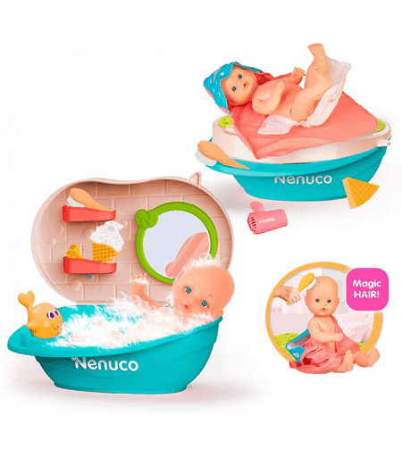 La vasca da bagno di Nenuco crea vera schiuma e si trasforma in un fasciatoio. Dai a Nenuco un bagno rilassante nella sua vasca con schiuma reale, poi avvolgilo nel suo asciugamano con cappuccio. Chiudi la vasca per trasformarla in un fasciatoio e cambia il pannolino, metti la crema e pettina i capelli magici di Nenuco. Nenuco è un bebè di 35 cm con corpo rigido, capace di bere, fare pipì e fare il bagno. ...