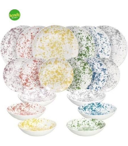 Servizio piatti Madison Apulia prodotto dal brand Tognana. Porta in tavola energia e creatività con Apulia , il servizio piatti in porcellana multicolor firmato Tognana. Il decoro effetto splash dona una mise en place moderna e vivace, perfetta per l'uso quotidiano e per stupire gli ospiti nelle occasioni speciali. Idoneo a microonde e lavastoviglie , unisce stile e praticità senza compromessi. Set completo per 6 persone : 6 piatti pianiØ 27 cm , 6 piatti fondi Ø 20 cm ., 6 piatti dessert Ø 19 cm . Caratteristiche Design contemporaneo : pattern multicolore a spruzzo che valorizza ogni tavola. Porcellana resistente : brillantezza e durevolezza neltempo. Uso quotidiano smart : compatibile con microonde e lavastoviglie per massima comodità. Set completo : copre dall'antipasto al dolce con formati coordinati. Materiale : porcellana Colore : multicolor Ideale per Tavole informali e cene tra amici Regalo casa nuova o lista nozze Chi desidera un tocco di colore senza rinunciare alla ...