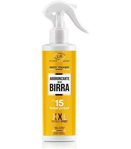 Abbronzante Alla Birra Super abbronzante spray con filtro di protezione SPF15, in un nuovo formato con pratico erogatore Trigger da 150ml, ideato per l'esposizioni solari più lunghe ed intense. I componenti principali sono la BIRRA e L'ALGA CORALLINA. Leggera emulsione spray dall'effetto protettivo grazie alla presenza di filtri solari a media protezione. Adatto a tutti i tipi di pelle (grassa, secca, mista, sensibile, matura, giovane, scura, chiara) Non contiene parabeni - Dermatologicamente testato Ingredienti Aqua, Prunus amygdalus dulcis oil, Ethylhexyl methoxycinnamate, Cetearyl alcohol, Glycerin, Titanium dioxide, Methylene bis-benzotriazolyl tetramethylbutylphenol (nano), Olea europaea fruit oil, Bis-ethylhexyloxyphenol methoxyphenyl triazine, Persea gratissima oil, Decyl glucoside, Corallina officinalis extract, Tocopheryl acetate, Panthenol, Ginkgo biloba leaf extract, Glycyrrhetinic acid, Allantoin, Phenoxyethanol, Parfum, Sodium acrylates copolymer, Dimethicone, ...