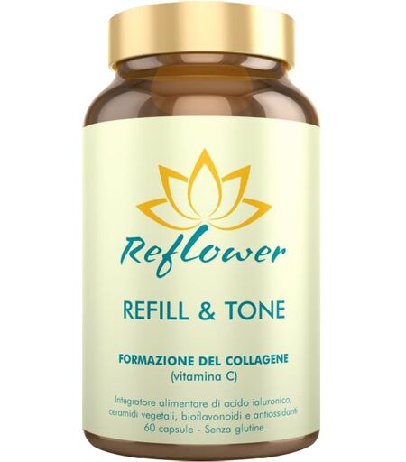 Reflower REFILL & TONE - Descrizione Integratore alimentare a base di acido ialuronico bioflavonoidi ceramidi vegetali e guggul che favorisce il trofismo e la funzionalità della pelle. Contiene poi vitamina C che contribuisce alla normale formazione del collagene per la normale funzione della pel… ...