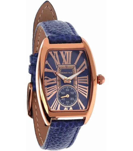Orologio Da Donna Della Collezione Watches. Realizzato In Lega Golden Rosé Placcata Oro Rosa 18kt. Cassa Rettangolare Di 40x30 Mm Con Numeri Romani E Piccolo Quadrante Tondo Che Segnano I Secondi. Cinturino In Pelle Stampata Blu, Lunghezza 21 Cm. ...
