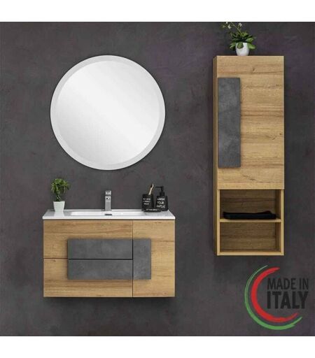 FERIDRAS - Mobile Bagno Sospeso Moderno Legno Rovere 100x47 cm Completo di Specchio Tondo