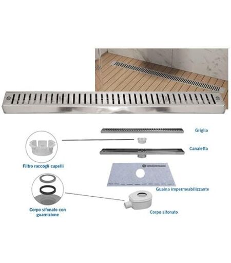 Canalette acciaio ad incasso per doccia in kit CN-01 Per realizzare bagni con scarico a filo pavimento. kit contenente: Corpo sifonato e filtro in ABS - Foglio di guaina impermeabilizzante - Canaletta e griglia in acciaio INOX AISI 304 CN55-01Kit: Griglia 55 cm. - Guaina 100x100 cm. ...