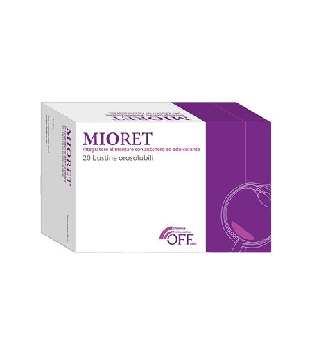 MIORET - Integratore alimentare con zucchero ed edulcorante. Conservazione Validità a confezione integra: 36 mesi. Formato Scatola con 20 bustine orosolubili. ...