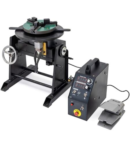 POSIZIONATORE DI SALDATURA TELWIN TR 30 M Posizionatore a tavola rotante con inclinazione manuale e velocità variabile. E' pensato per sostenere e movimentare pezzi su cui eseguire saldature circolari su asse verticale ad una velocità impostata da display. Piano di lavoro inclinabile da 0 a 90° Mandrino a 3 ganasce Interruttore a pedale 230V 1ph Capacità 30kg in orizzontale, 10kg in verticale. Giri/min 0.01-6 Diametro Tavola rotante 200 Peso 34kg ...