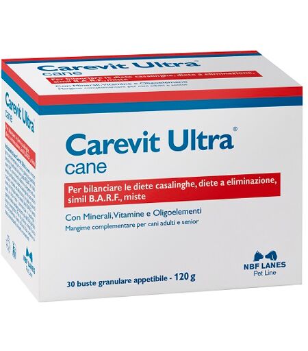 Carevit Ultra cane - Descrizione Carevit Ultra cane è un mangime complementare per cani in granulare appetibile, formulato rispettando le linee guida FEDIAF ed i riferimenti NRC, con minerali, vitamine e oligoelementi essenziali per bilanciare la dieta casalinga del cane adulto e anziano, le diete … ...