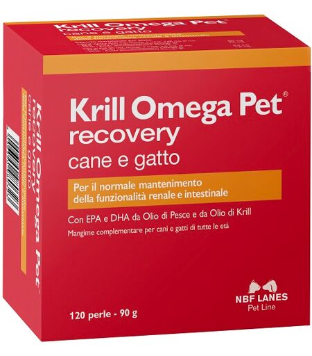 NBF LANES Krill Omega Pet recovery Mangime complementare per cani e gatti Ad alto tenore di PUFA Omega 3 (a lunga catena) e di Krill Oil Prodotto adiuvante nel trattamento di affezioni irritative grazie all'apporto di krill oil e di olio di pesce. Cani: • a livello sistemico: affezioni renali ipe… ...