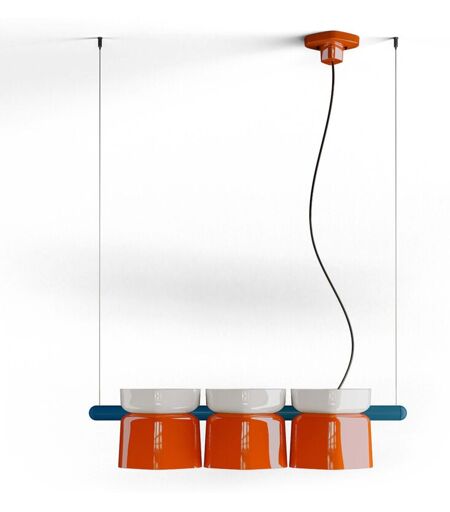 Collezione YAKITORI L'ILLUMINAZIONE CHE ANIMA OGNI SPAZIO. Sospensione a 3 luci E27 max 53W (non incluse) in ceramica bianco e arancio volpe con barra metallica blu. L.104,5 x H.110cm. Con i suoi elementi multipli sospesi a mezz'aria che paiono quasi essere infila ti su un grande stecco, Souvlaki/Yakitori ci resituisce l'immagine allegra ed epi curea che si respira attorno a una banca rella di street food, coi suoi colori folklo ristici e il brulicare di clienti e insegne. Gli elementi ceramici, infatti, pensati in diverse associazioni cromatiche, vengo no montati a sandwich su una barra metallica colorata a contrasto, garantendo la flessibilità costruttiva necessaria per illuminare la superficie di un bancone, le scrivanie di un ufficio, una tavola im bandita o anche i corridoi di uno spazio retail. ...