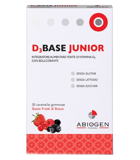 D3BASE JUNIOR Descrizione del parafarmaco D3base Junior 30caram Frut Bos - Integratore alimentare fonte di vitamina D3 (colecalciferolo) in forma di caramelle gommose con edulcorante. D3Base Junior è indicato per i bambini dai 4 anni in su. D3Base Junior è adatto per integrare le esigenze nutrizion… ...