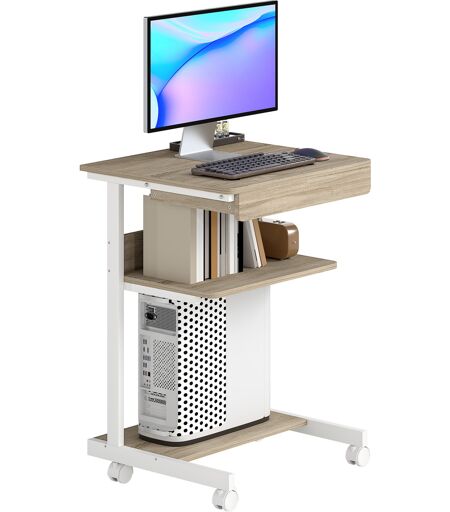 Homcom Scrivania PC con Cassetto Scorrevole, 2 Ripiani e 4 Rotelle, in Legno e Metallo, 56x51x79 cm, Bianco e Rovere Aosom Italy