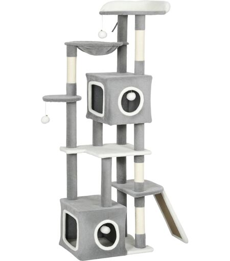 Pawhut Albero Tiragraffi per Gatti con 2 Casette, Rampa, Trespoli e 4 Palline, 48x40x165 cm, Grigio e Bianco Aosom Italy