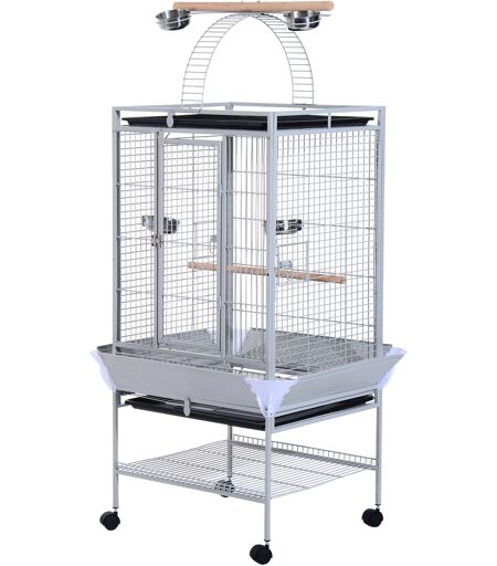 Pawhut Voliera per Uccelli con Ruote Altezza 161.5cm, Vaschette in Acciaio e Trespoli in Legno, Argento Aosom