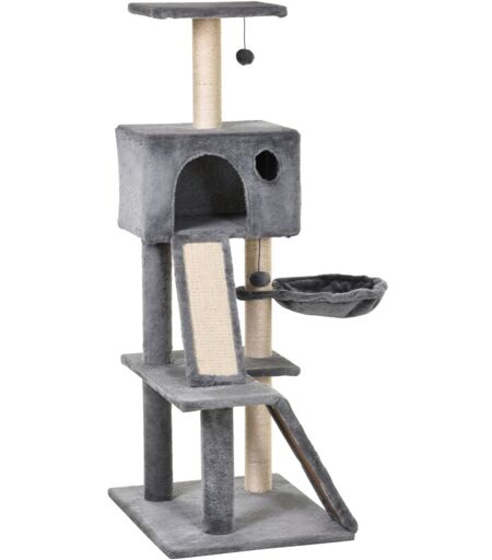 Descrizione: Soddisfa l'istinto naturale dei gatti di arrampicarsi con questo albero tiragraffi PawHut! La struttura multilivello fornisce spazio sufficiente per muoversi e la cuccia offre uno spazio confortevole in cui riposare. I pali tiragraffi con corde in sisal stimolano i gatti ad affilarsi le unghie, evitando che graffino i mobili. Fai felici i tuoi mici con questo albero per gatti! Caratteristiche: ● Design multilivello per far divertire i tuoi gatti ● Rivestito con morbido peluche ● I tiragraffi sono realizzati per soddisfare il bisogno di graffiare e favorire il benessere delle unghie dei gatti ● Struttura in solido legno truciolare E1, sicuro e atossico ● Tonalità di colore neutra che si abbina con ogni arredamento della tua casa ● Salvaspazio, divertimento per i tuoi gatti con il minimo ingombro ● Montaggio richiesto Dati tecnici: ● Colore: Grigio ● Materiale: MDF classe E1, Peluche, Sisal ● Dimensioni generali: 60L x 49P x 130A cm ● Dimensione cuccia: 41L x 29P x 26A cm ● ...