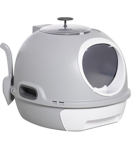 Con un design unico, questa lettiera coperta di PawHut garantirà al tuo gatto una privacy completa e aiuterà a contenere gli odori. Con un originale aspetto a capsula spaziale, la lettiera per gatti offre un ampio spazio interno ed è dotata di due portea. La cassetta igienica per gatto è fornita con una paletta che puoi appendere sull'apposito supporto laterale e dispone di un vassoio inferiore estraibile per pulire comodamente la sabbietta. ...