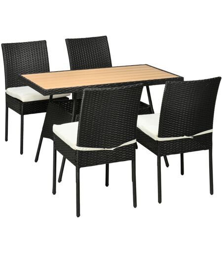 Riunisci amici e familiari intorno a un tavolo per pranzi e chiacchiere in compagnia: ci pensa Outsunny a darti l'arredo giusto. Questo set composto da un tavolo con 4 sedie, è realizzato con telaio in acciaio robusto e rivestito con rattan PE resistente alle intemperie. Il piano del tavolo in plastica con effetto legno è solido e facile da pulire. Le sedie con schienale alto e cuscino morbido ti offrono il massimo della comodità. Il set giusto per ogni esigenza! ...