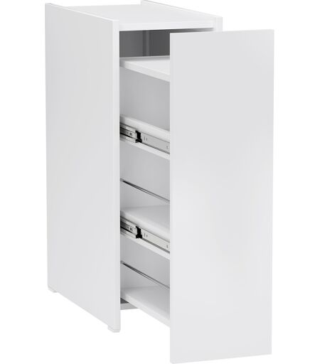 Accogli l'eleganza della semplicità nei tuoi spazi privati con il mobile da bagno HOMCOM. Dotato di un cassetto scorrevole e 3 ampi ripiani, questo mobiletto ti permette di inserire facilmente rotoli di carta, candeggina, deodoranti e detergenti al suo interno, muovendosi su binari e ruote con fluidità. Il design sottile e compatto in bianco permette di inserirsi armoniosamente in qualsiasi spazio, abbellendo il bagno con il suo stile minimalista e la solida struttura in truciolato. ...