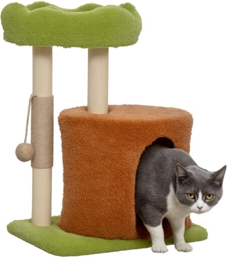 Pawhut Albero Tiragraffi per Gatti con Casetta, Lettino e Pallina Giocattolo, in Legno e Peluche, 44x33x61 cm, Verde