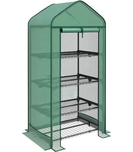 Outsunny Serra per Orto 69x49x158 cm Struttura in Metallo e Copertura in PE Anti-Raggi UV con Porta Avoolgibile e 4 Ripiani, Verde Scuro Aosom