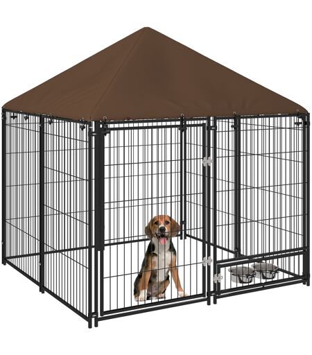 Pawhut Recinto per Cani in Metallo e Tessuto Oxford con Porticina per Ciotole, 141x141x151 cm, Nero e Marrone
