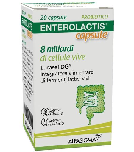 ENTEROLACTIS capsule - Descrizione Integratore alimentare di fermenti lattici vivi. L'apporto di probiotici è indicato nel riequilibrio della flora batterica intestinale conseguente ad abitudini alimentari scorrette o terapie antibiotiche. - Ingredienti L. casei DG (Lacticaseibacillus para casei DG… ...