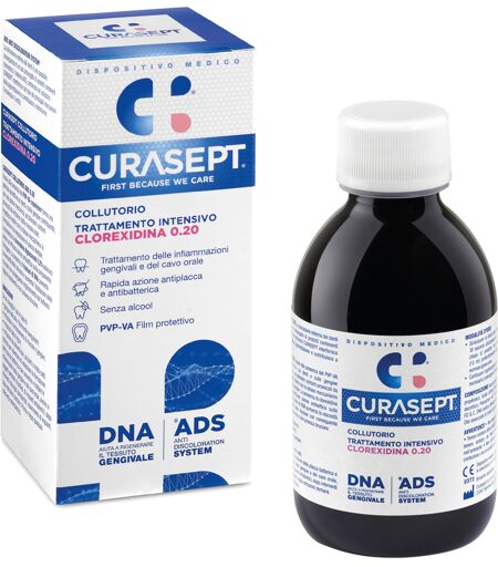CURASEPT ADS DNA TRATTAMENTO INTENSIVO - Collutorio - Clorexidina 0,20 con ADS - Descrizione Rapida azione antiplacca e antibatterica. Trattamento delle infiammazioni gengivali e del cavo orale. La Clorexidina digluconato 0,20% assicura anche un'efficace azione antisettica. Le frazioni di DNA aumen… ...